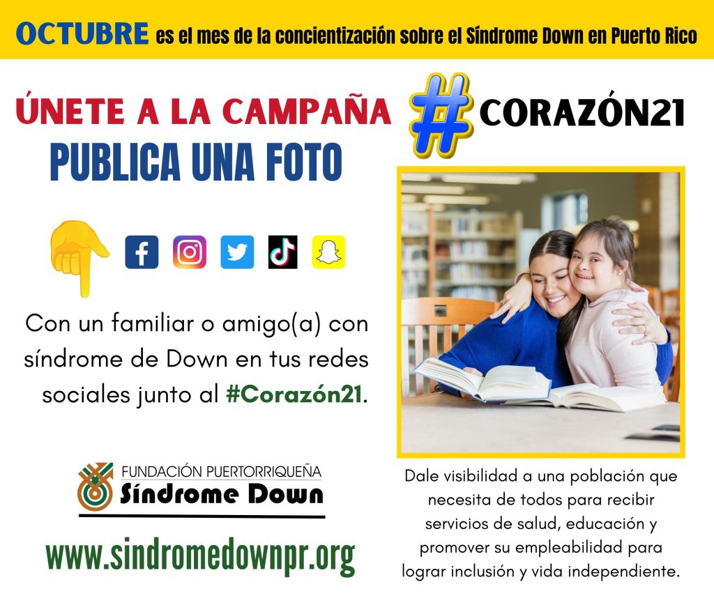 De otro lado, como parte de una campaña para redes sociales, invitamos a las personas a que publiquen durantes el mes de octubre una foto con un familiar, amigo(a) o conocido con síndrome de Down junto al (hashtag) #Corazón21 y que nos etiqueten o envíen para compartirla en nuestra página de Facebook.