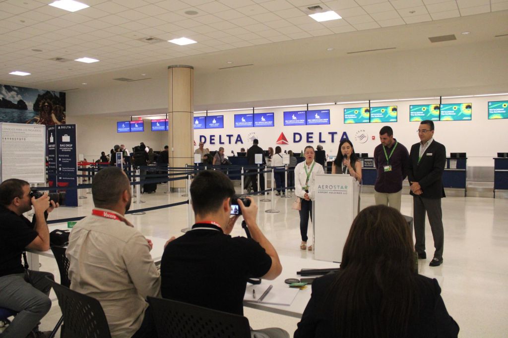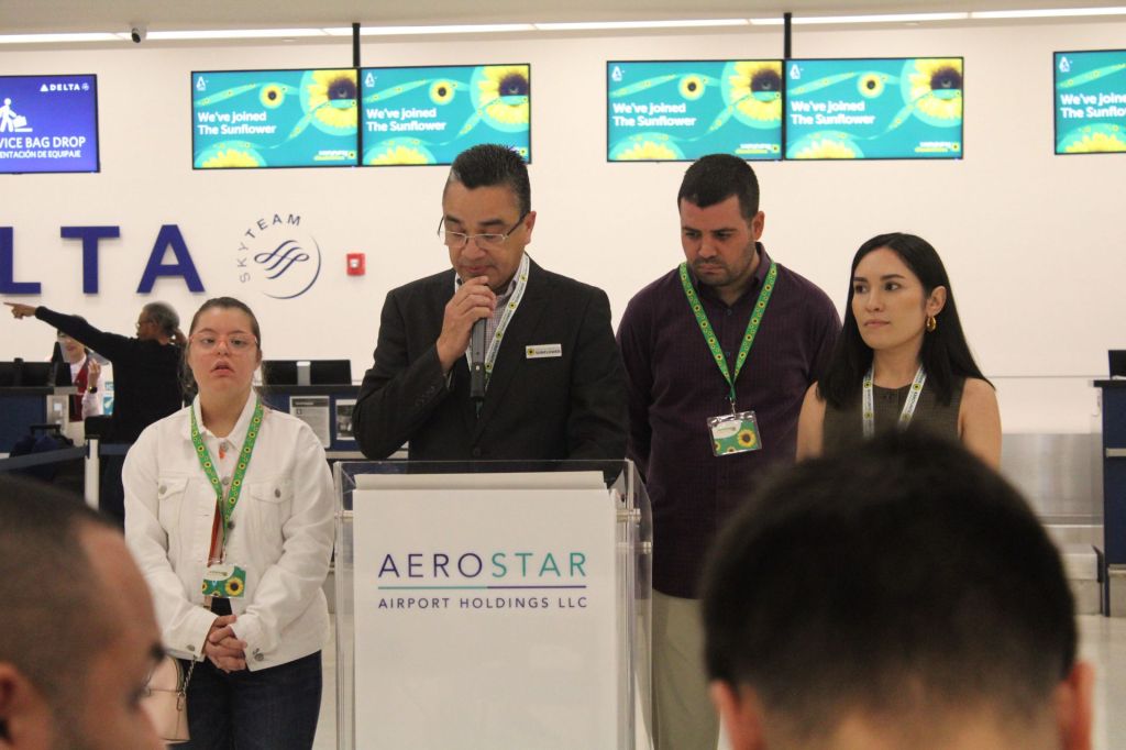 Durante el evento, los participantes de la FPSD José Rivera Ortiz y Frances Torres Camacho modelaron el uso del lanyard de girasol, demostrando cómo esta herramienta permite a los viajeros comunicar discretamente que podrían necesitar asistencia adicional o más tiempo en los procesos aeroportuarios. Su participación mostró, de manera tangible, el impacto positivo de iniciativas que ponen la accesibilidad y la empatía en el centro del servicio al viajero.