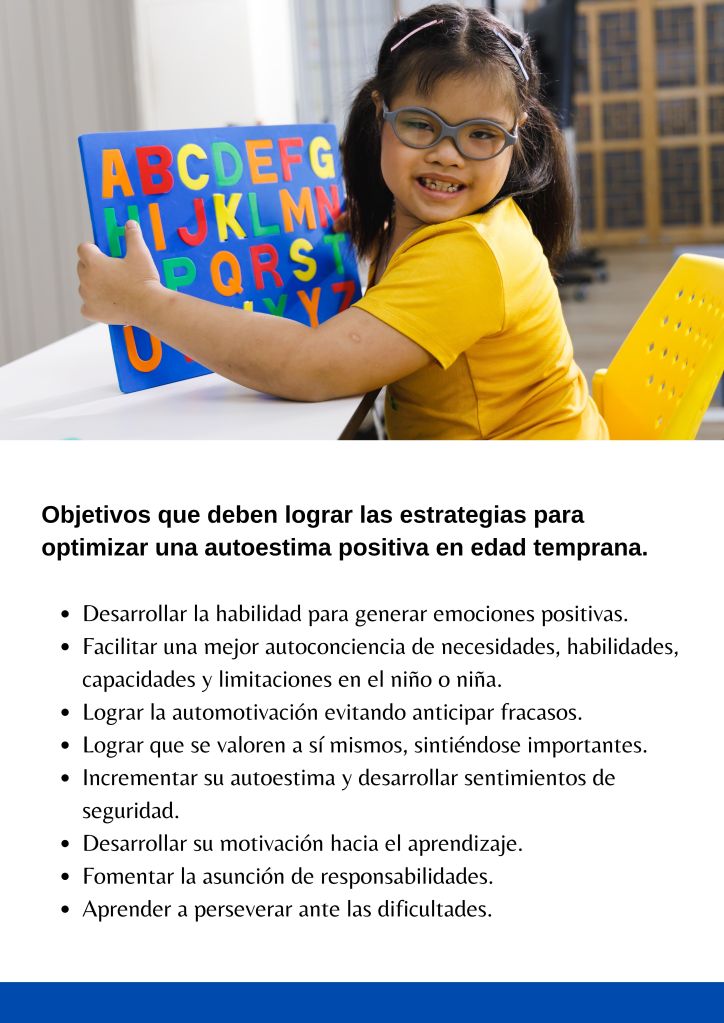 Asimismo, se promueve la autoestima con el aprendizaje valorizando una autoimagen positiva y creando confianza en sí mismo. Hay que destacar que el fortalecimiento del entorno familiar para el desarrollo propio, así como de su autopercepción, autoobservación y autoaceptación hay que fomentarlo día a día.